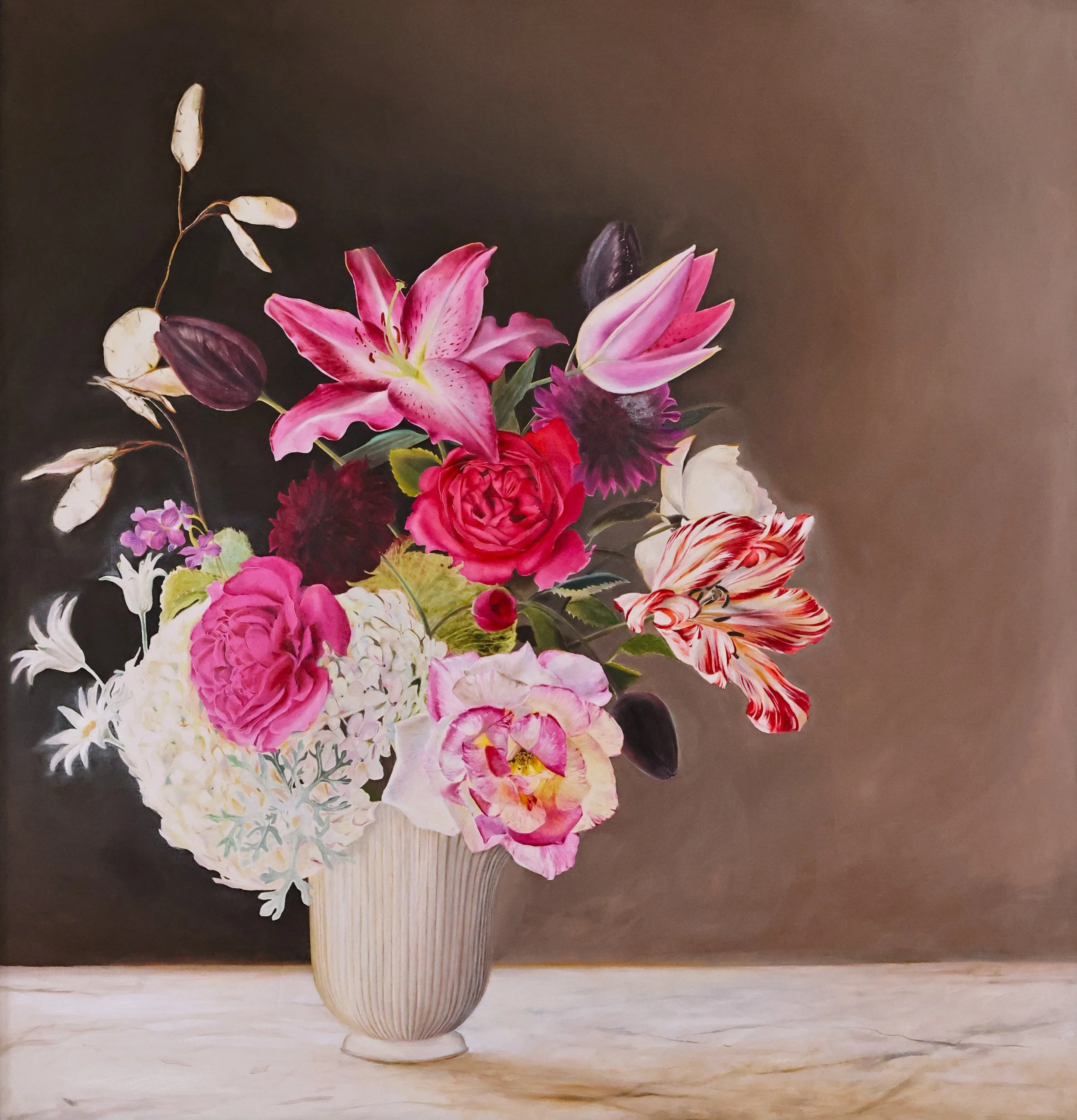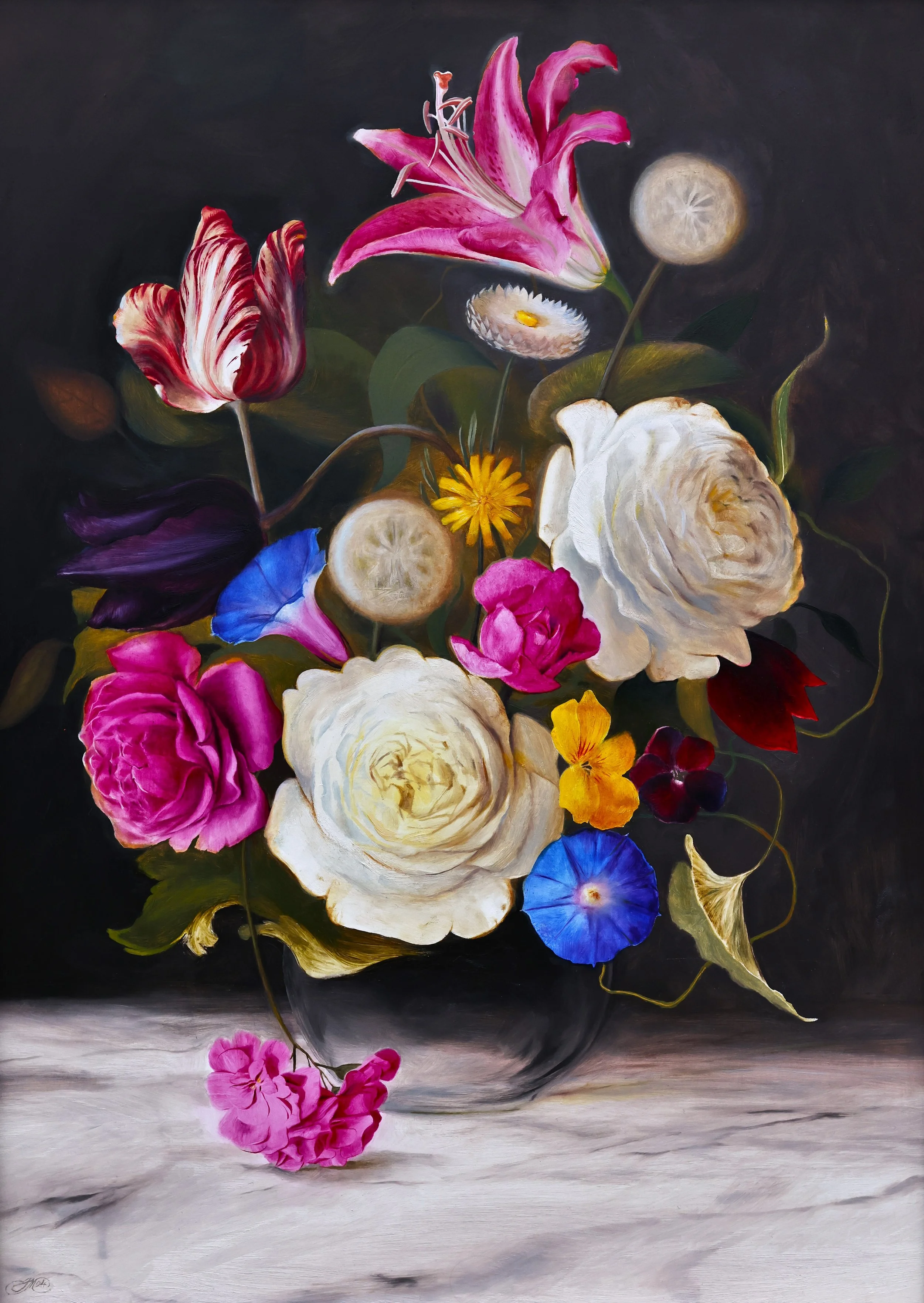 This particular bloom is inspired by Still Life Of Roses, Tulips, A Sunflower And Other Flowers In A Glass Vase With A Bee, Butterfly And Other Insects Upon A Marble Ledge which sold in London in 2013 for GBP 1,650,500.00 My painting is a portrait of Ruysch and a tribute to her enduring legacy and indomitable success.